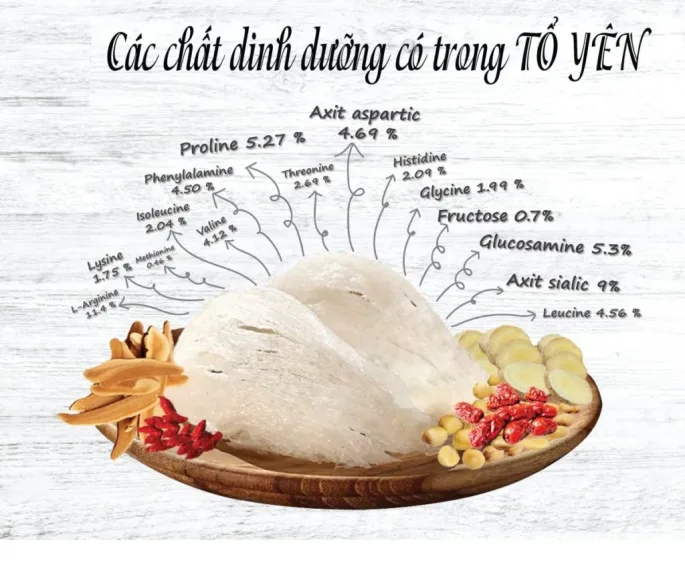 Theo nghiên cứu của Trung tâm Công nghệ Sinh học Đại học Thủy Sản và Viện Công nghệ Sinh học, trong thành phần của yến sào chứa 18 loại acid amin trong đó có một số loại có hàm lượng cao như Aspartic acid, Serine, Tyrosine, Valine, Leucine,… Hàm lượng acid Syalic chiếm 8,6% và Tyrosine có tác dụng làm phục hồi các tổn thương khi bị nhiễm độc, kích thích phát triển hồng cầu.